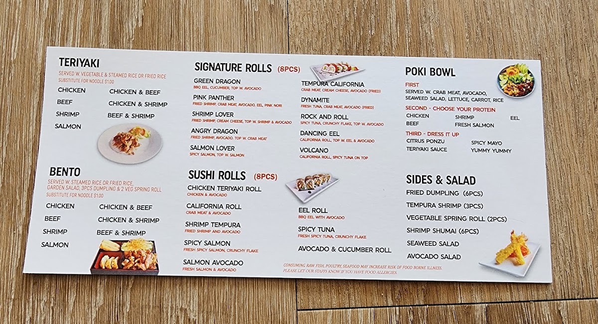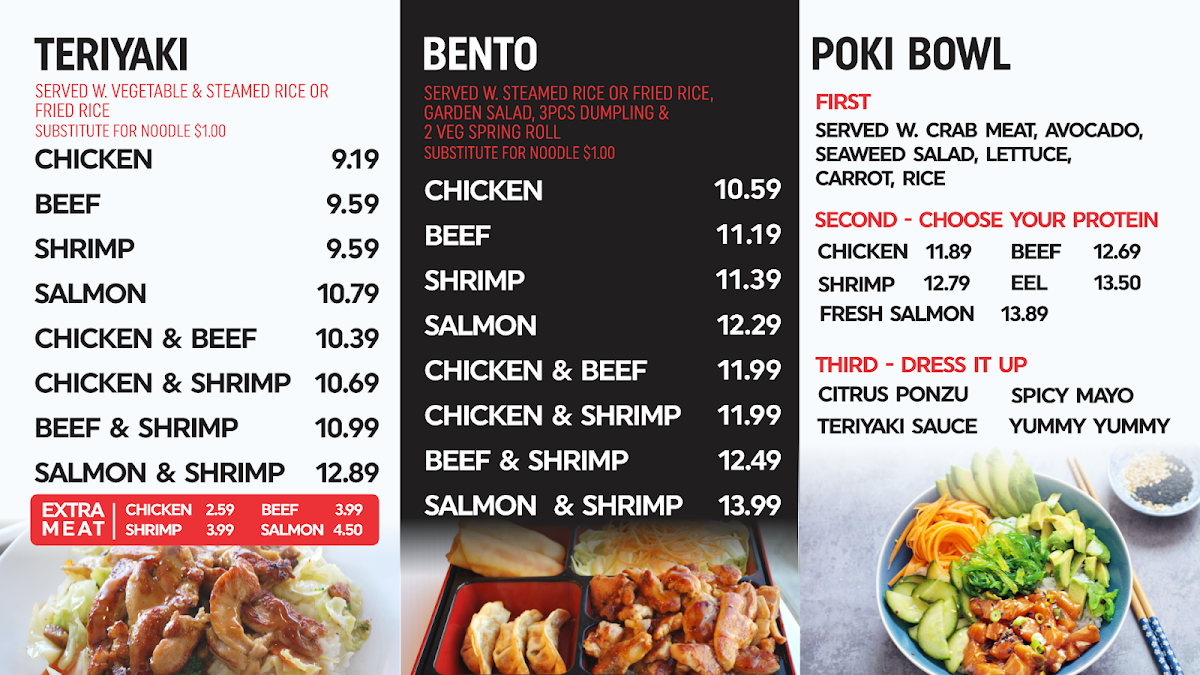 The menu also stays true to sushi fundamentals with its Sushi Rolls, such as Spicy Salmon, Salmon Avocado, Spicy Tuna, Shrimp Tempura Roll, and California, which cater to both adventurous palates and those who prefer familiar flavors. Meanwhile, the Poke Bowl options-Poke Beef, Poke Shrimp, Poke Salmon (Raw), and Poke Chicken-add a fresh, customizable feel to the menu, appealing to diners looking for something lighter yet flavorful. Teriyaki lovers are well served with hearty choices like Chicken & Beef Teriyaki, Chicken & Shrimp Teriyaki, Beef & Shrimp Teriyaki, Shrimp Teriyaki, and Beef Teriyaki, all of which emphasize comforting, savory notes that pair perfectly with rice.